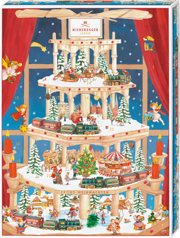 Julnöje med variation. Med Niederegger adventskalender "Pyramid" är semestern inte tråkiga. För i 24 dörrar gömmer den eleganta kalendern med klassiska pyramidmotiv 36 läckra specialiteter. Njut av varje dag av en delikatesser och upptäck olika delikatesser av krokant och marsipan.